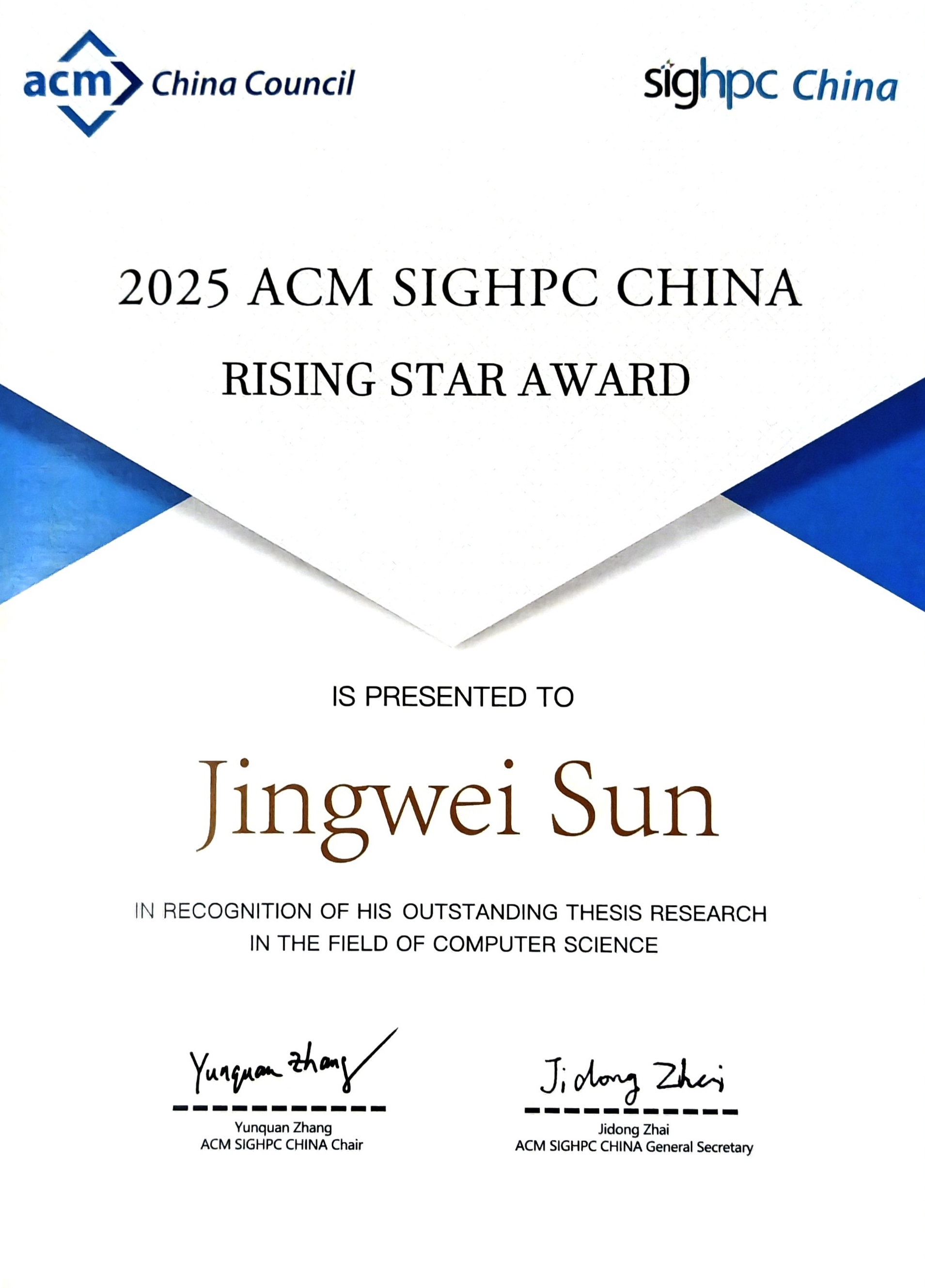 近日,研究组教师、特任副研究员孙经纬博士荣获 2025 年度 ACM SIGHPC 中国“新星奖”。